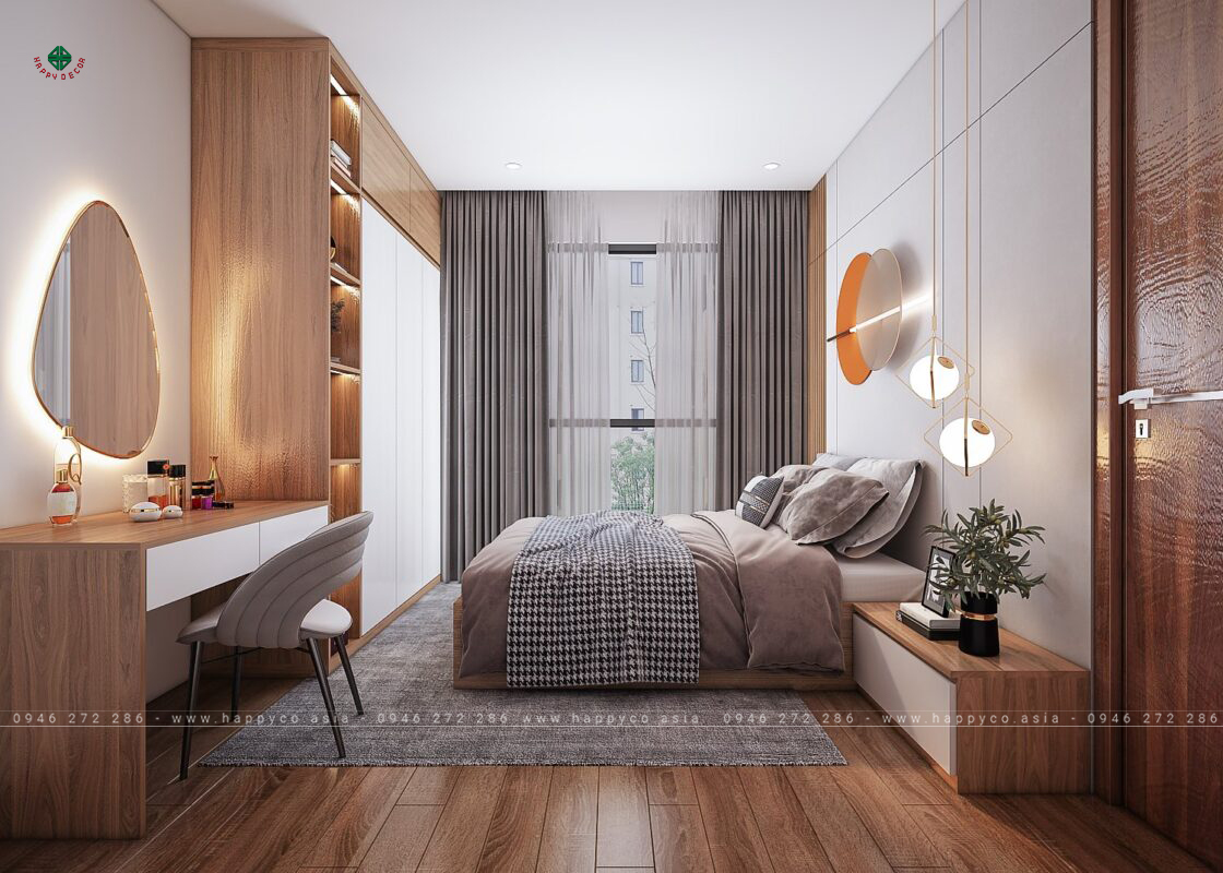 Sự kết hợp hài hòa giữa tủ quần áo giúp không gian phòng ngủ thoải mái, lấy sáng đến từng chi tiết trang trí nhỏ nhất. Bàn trang điểm có hình dáng độc đáo và ánh sáng ấm áp nổi bật, mang đến cảm giác sang trọng ngay từ khi bước vào phòng.