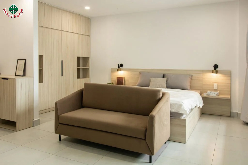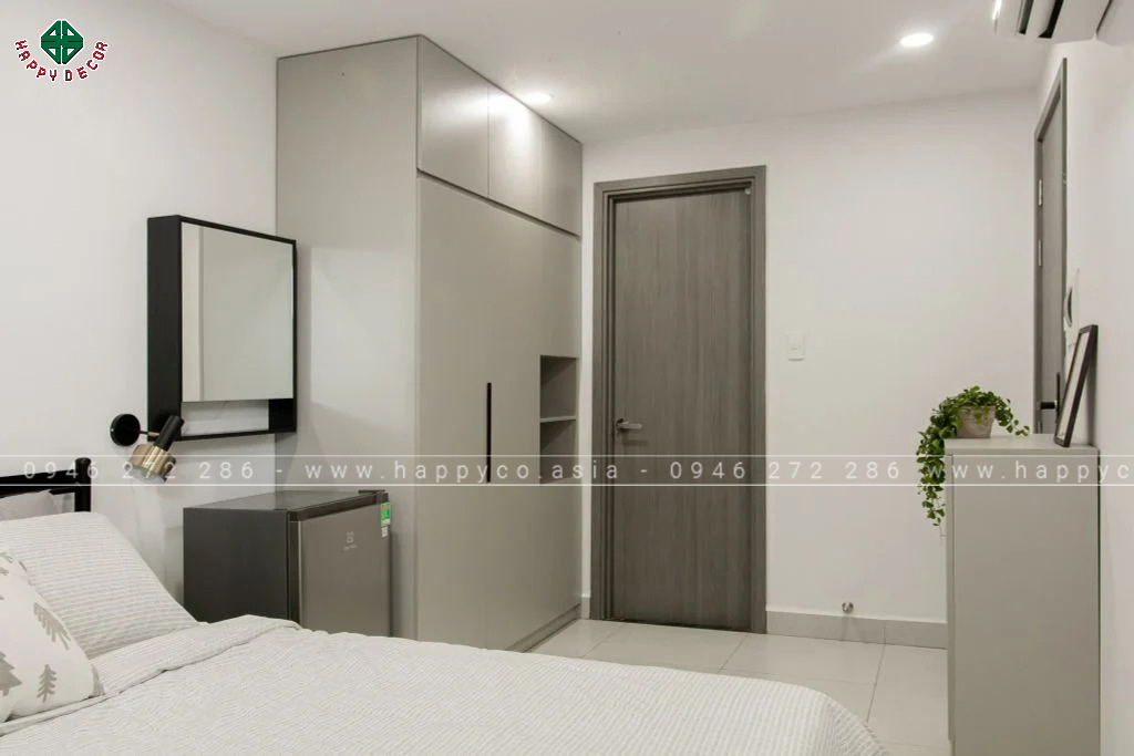 Không gian lưu trữ được tối ưu với tủ quần áo từ sàn đến trần, tích hợp kệ mở để vừa chứa đồ vừa trang trí. Các kệ nhỏ gần cửa ra vào hay cạnh giường giữ cho không gian luôn gọn gàng. Đây là ý tưởng thiết kế nội thất căn hộ nhỏ mà mọi gia đình Việt Nam có thể áp dụng.