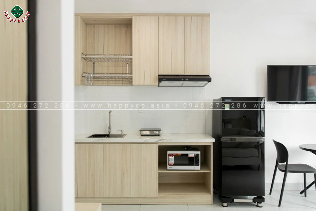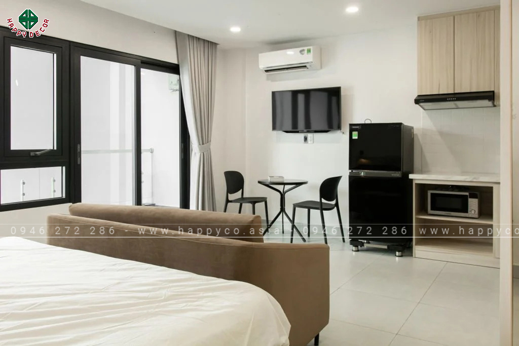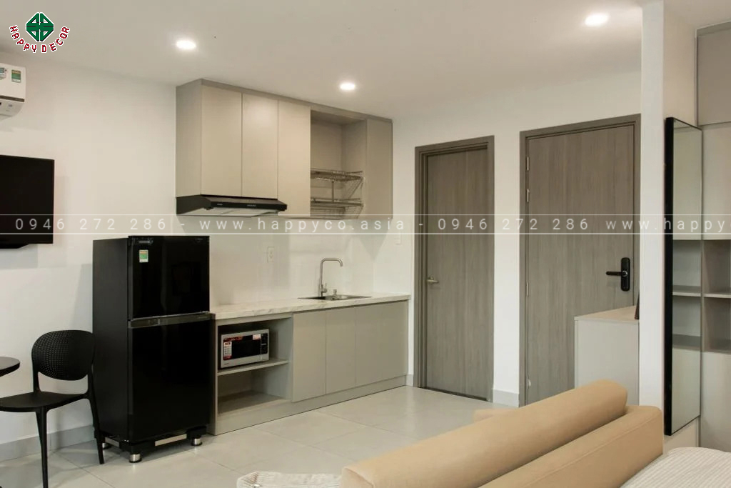 Thiết kế nội thất căn hộ này tích hợp đầy đủ tiện nghi: giường, bếp, tủ, bàn ghế và phòng tắm. Sofa màu trắng beige với chân mảnh tạo cảm giác thoáng đãng. Bếp nhỏ với mặt bàn đá marble và tủ gỗ sáng màu mang lại vẻ sang trọng, gọn gàng.