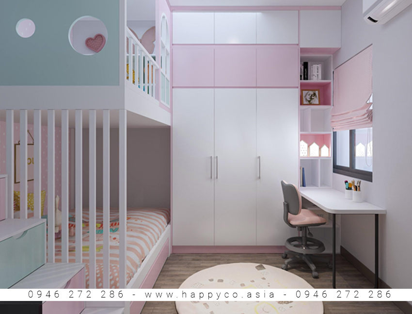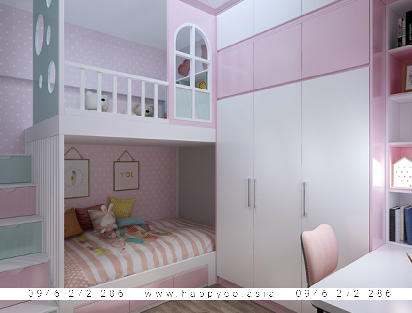 Phòng ngủ trẻ em được thiết kế với sắc hồng nhằm đáp ứng sở thích của trẻ. Giường tầng, tủ quần áo và bàn học được đồng bộ với nhau từ cùng một chất liệu gỗ công nghiệp, được sơn phủ bằng các màu trắng, hồng và xanh. Việc sử dụng giường tầng cho phép hai bé gái sử dụng cùng lúc hoặc biến giường trên thành không gian chơi đồ chơi cho trẻ.