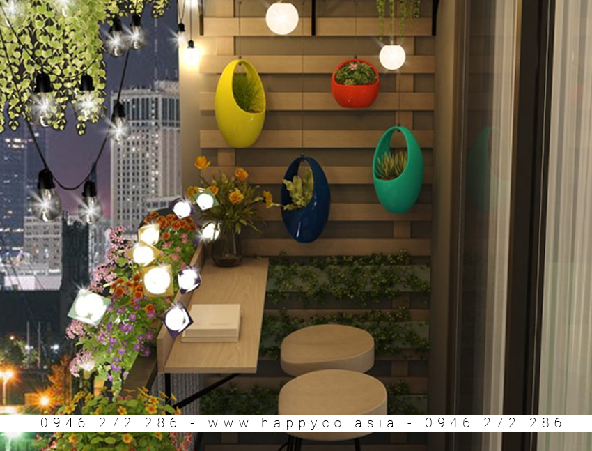 Khu vực ban công được tận dụng để tạo thành một khu vườn mini xanh mướt. Bàn ghế gỗ với chân sắt được đặt sát lan can ban công, kết hợp với chậu cây hoa đa sắc và đèn chiếu sáng, tạo ra không gian ngoài trời lý tưởng cho gia đình thư giãn và tận hưởng.