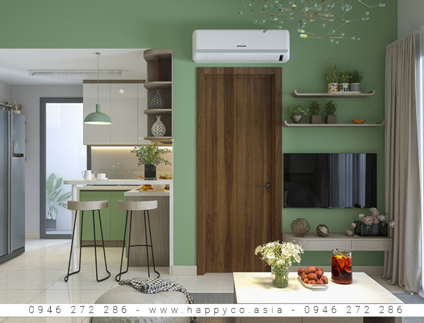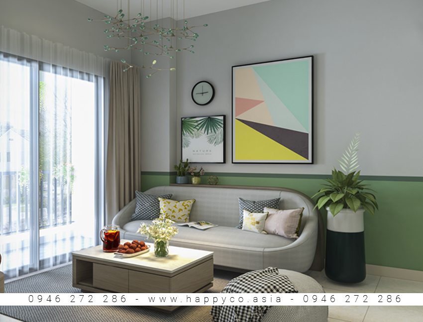Trong việc thiết kế không gian xanh cho phòng khách, chúng tôi đã chọn sử dụng màu xanh lá cây tự nhiên làm tông màu chủ đạo. Màu sắc này được sơn lên các mảng tường, tạo ra một không gian nội thất xanh mát tổng thể. Khi bước vào phòng khách, người ta có thể cảm nhận được sự tươi mát từ màu sắc xanh của tường, cây cỏ trang trí và tranh treo tường liên quan đến thiên nhiên. Với phông nền màu xanh này, các món đồ nội thất như bàn trà và ghế sofa được lựa chọn theo tông màu trắng hoặc xám, tạo nên một sự tương phản tươi sáng.