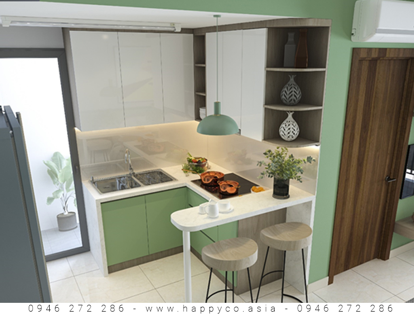 Màu xanh cũng xuất hiện ở phần tủ chạn dưới, tạo sự tương phản với màu trắng sáng của bếp nấu và phần tủ chạn trên. Việc sử dụng màu xanh một cách điều độ trong không gian nhỏ sẽ giúp cân bằng màu sắc mà không làm mất đi tổng thể của căn phòng. Bếp cũng có một cửa lách dẫn ra ban công, giúp đảm bảo ánh sáng và thông gió cho quá trình nấu ăn.