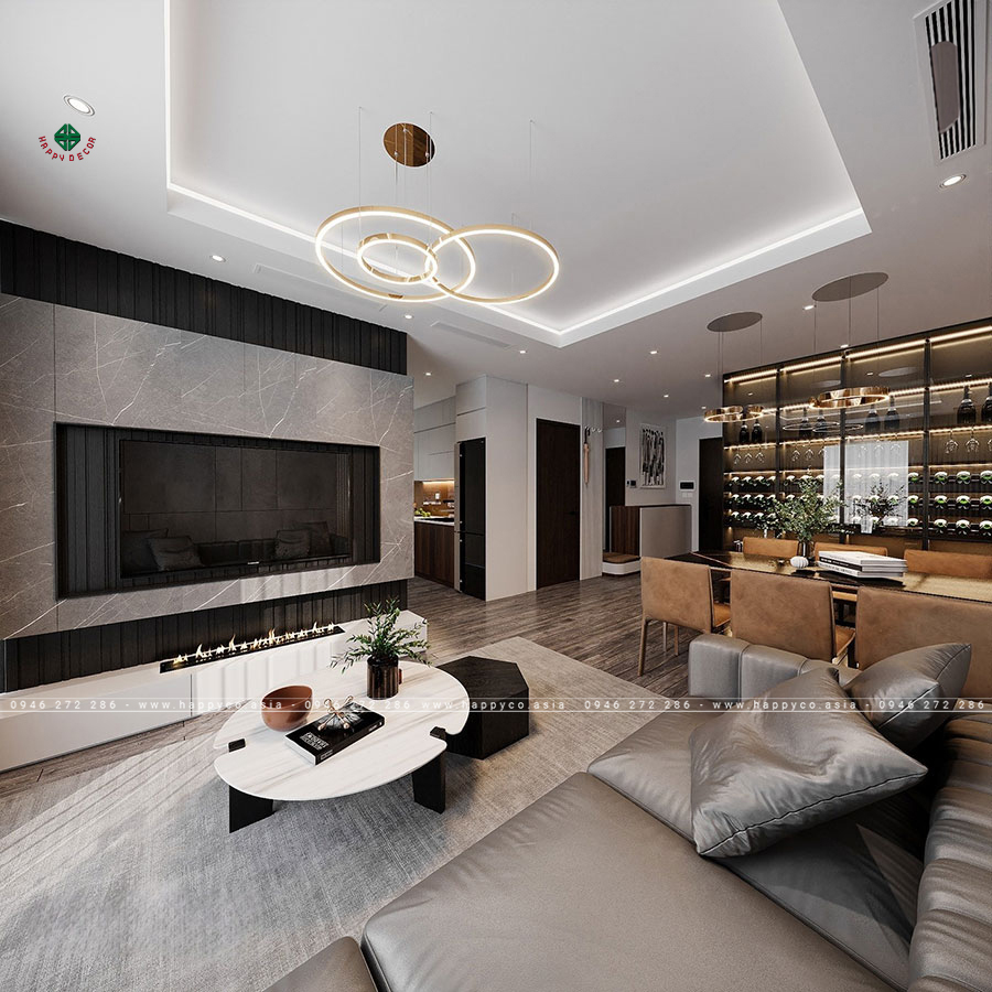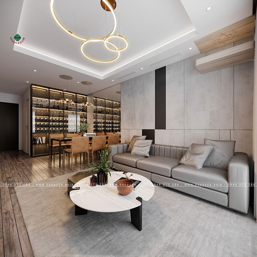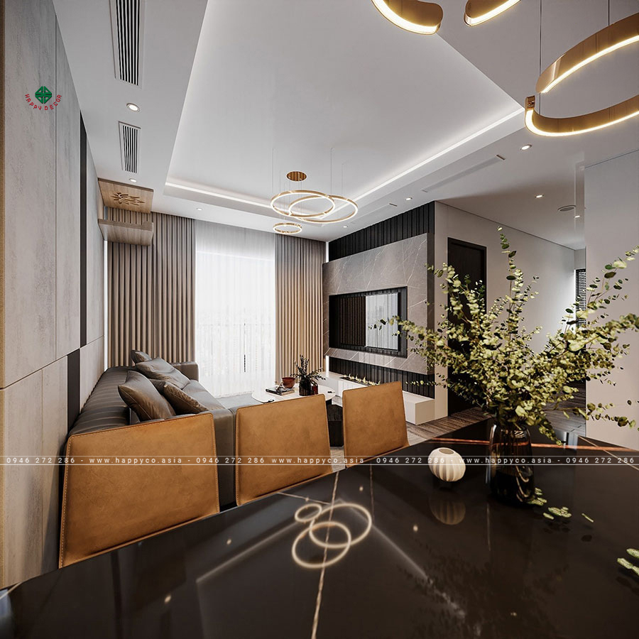 Phòng khách là không gian quan trọng trong mỗi căn hộ, là nơi gia đình, bạn bè có thể quây quần, thư giãn và tận hưởng những giây phút khó quên. Vì vậy, kiến trúc sư Happy Decor đã đề xuất ý tưởng thiết kế lấy cảm hứng từ phong cách hiện đại, pha trộn tông màu trắng với các màu khác như xám, nâu nhạt, giúp tạo nên không gian lễ tân trang nhã, sang trọng.
