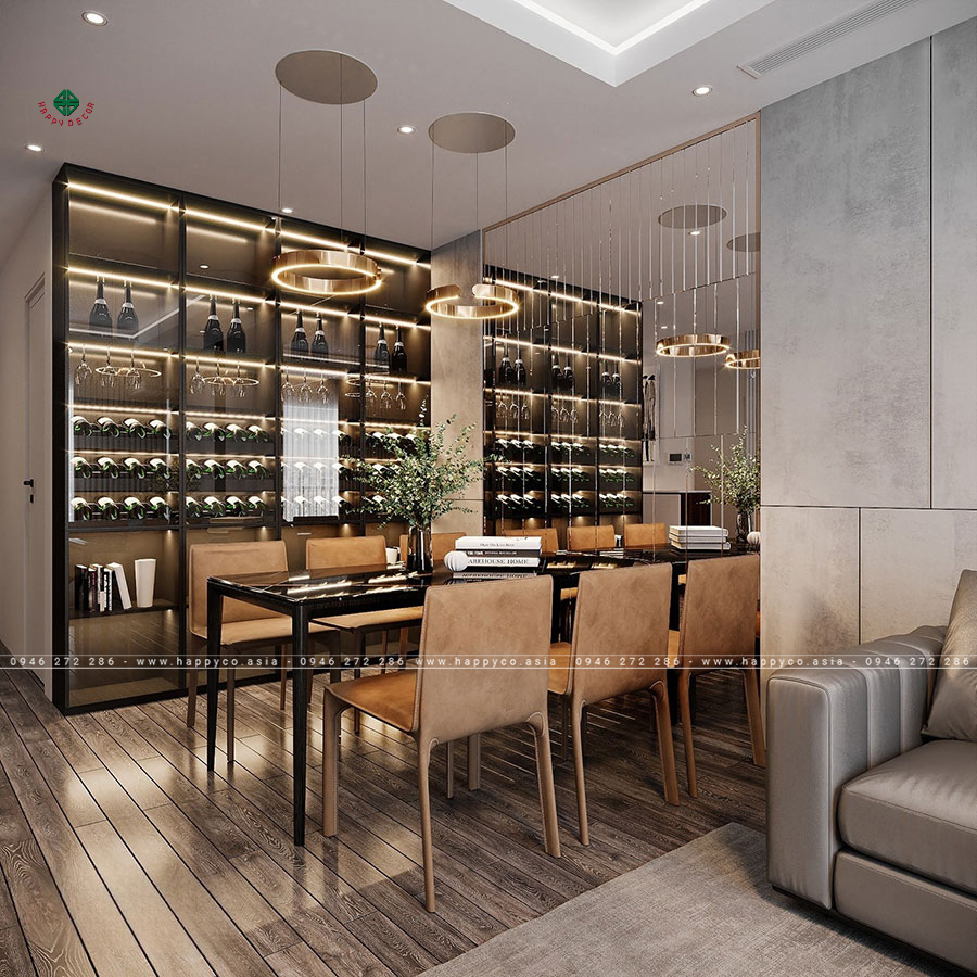Để tạo không gian ấn tượng, chúng tôi lắp đặt thêm tủ trưng bày rượu có cửa kính cường lực trong suốt. Nội thất được chia thành các ngăn rõ ràng và kết hợp với hệ thống đèn LED giúp tạo nên một không gian đẹp mắt.