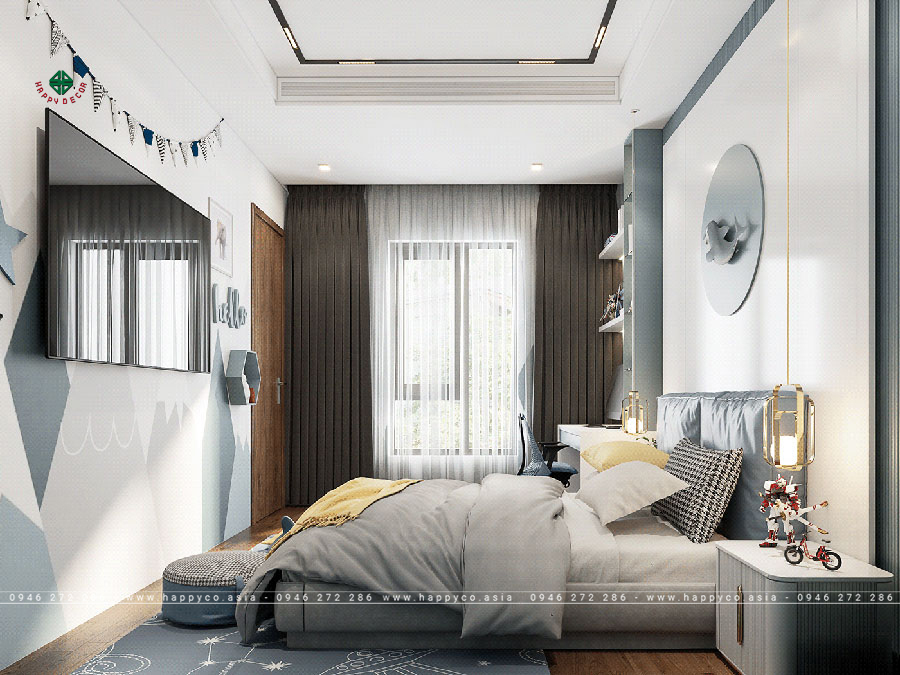 Phòng ngủ tiếp theo được thiết kế dành riêng cho cậu con trai út và các kiến trúc sư Happy Decor muốn mang đến một thiết kế sống động, trẻ trung cho không gian. Chúng tôi chọn hai gam màu chủ đạo là xanh lam và trắng làm tông màu chủ đạo xuyên suốt bố cục tổng thể của không gian.