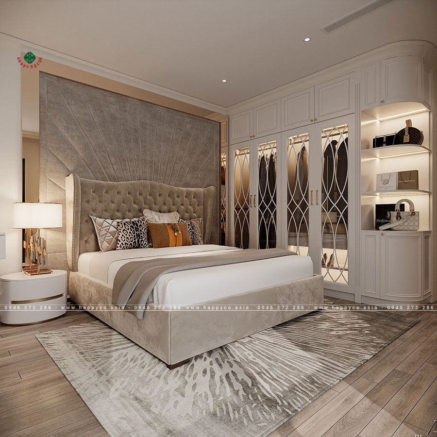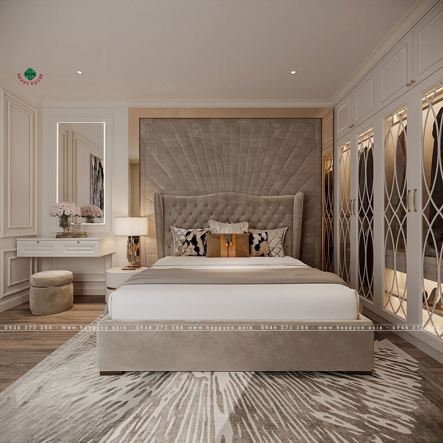 Đặt một tủ quần áo tân cổ điển rộng rãi để đựng quần áo, đồ dùng cá nhân. Tủ có thể có cửa gỗ chạm khắc hoặc các chi tiết nghệ thuật khác để phù hợp với phong cách tân cổ điển.