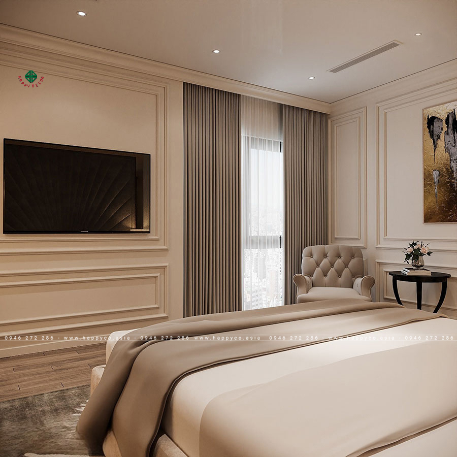 Phòng ngủ chính là không gian dành riêng cho vợ chồng Hương. Vì vậy, chúng tôi ưu tiên một không gian rộng rãi, thoáng mát hơn các phòng ngủ khác cho hai con. Chúng tôi chọn tông màu trung tính làm màu chủ đạo của căn phòng.
