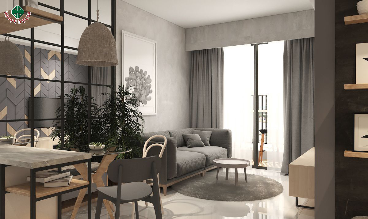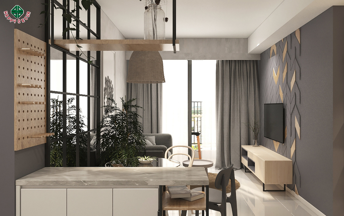 Cây xanh & ánh sáng tự nhiên: Happy Decor bố trí cây xanh một cách hợp lý, kết hợp với cửa kính lớn để tận dụng ánh sáng tự nhiên, mang lại sự tươi mới cho căn phòng.
