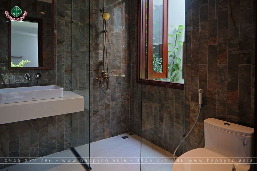 Một điều bất ngờ nằm ở phòng tắm: bồn tắm được đặt cạnh cửa sổ lớn nhìn ra mảng xanh bên ngoài. Cảm giác ngâm mình trong làn nước mát, đón chút nắng nhẹ xuyên qua lớp rèm trắng, nghe tiếng gió thổi qua tán cây… như một buổi trị liệu tinh thần. Vật liệu trong phòng tắm được chọn lựa kỹ càng từ đá tự nhiên, gạch xám vân nhẹ, kính trong suốt – tất cả tạo nên cảm giác sạch sẽ, thư thái.