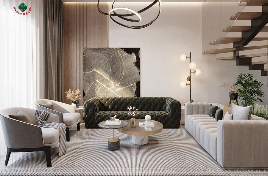 Bộ ghế sofa là tâm điểm của phòng khách, nổi bật với thiết kế hiện đại và sự kết hợp màu sắc tương phản