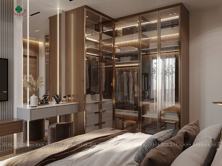 Hệ thống tủ quần áo với thiết kế hiện đại và cửa kính trong suốt đẹp mắt