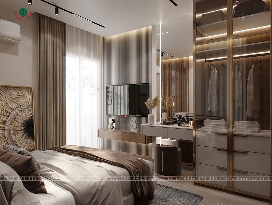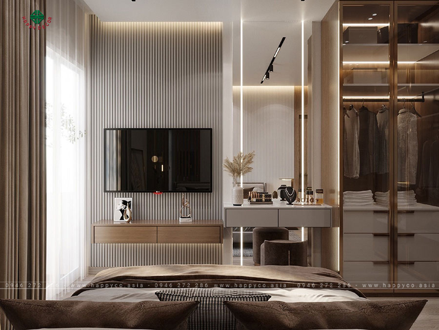 Để tiết kiệm tối đa không gian căn phòng, chúng tôi tận dụng một góc không gian để bố trí hai hệ thống tủ và bao bọc toàn bộ góc bằng cửa kính trong suốt tạo nên không gian đẹp hơn. Bên cạnh là bàn trang điểm và khu vực tivi cũng vô cùng bắt mắt và giúp không gian trở nên thoải mái hơn.