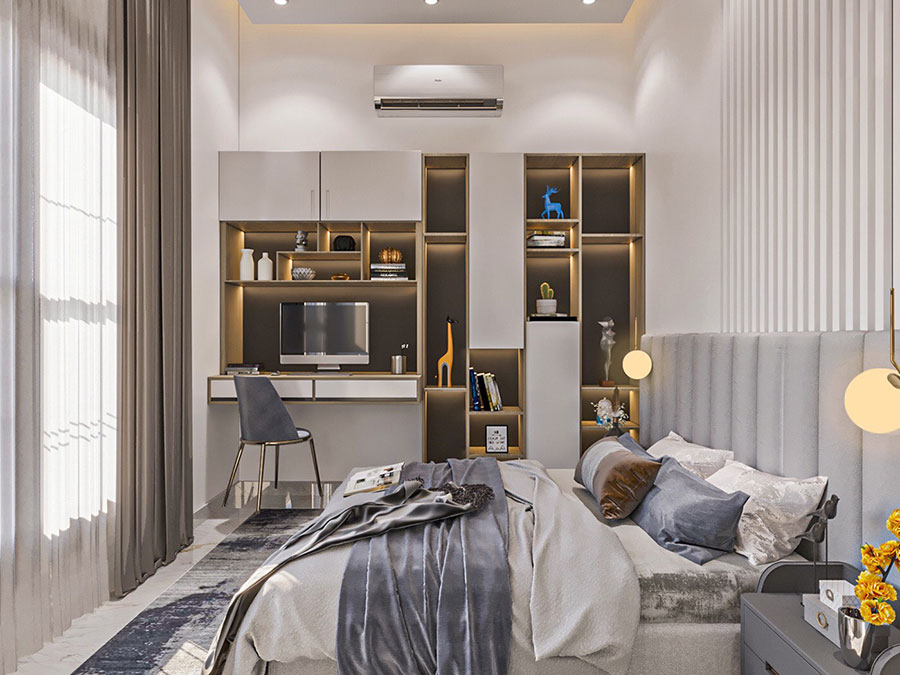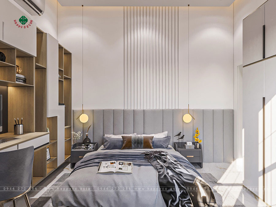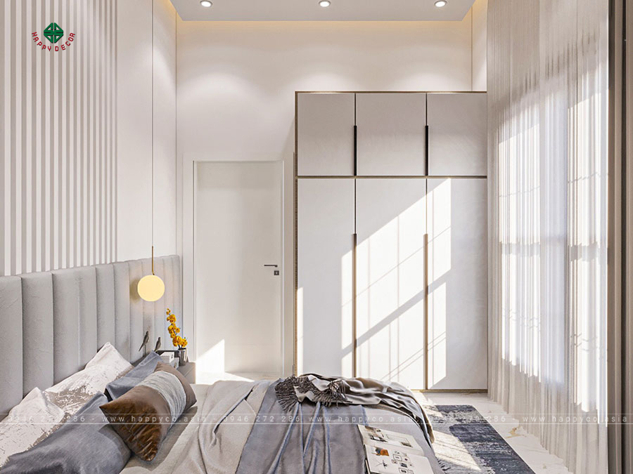 - Phòng ngủ có thiết kế hiện đại với màu trắng làm chủ đạo