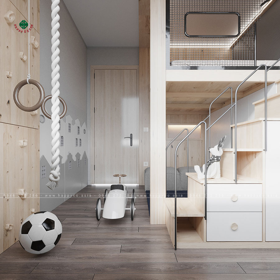 Các món đồ nội thất được lựa chọn hợp lý và sắp xếp khoa học. Điều đặc biệt hơn nữa là kiến trúc sư Happy Decor đã nghĩ ra thiết kế giống “ngọn đồi trên nhà sàn” ngay trong phòng ngủ này. Phần dưới có tủ đựng quần áo và đựng đồ, phần trên là giường với nệm êm ái mang đến cho bé giấc ngủ yên bình.