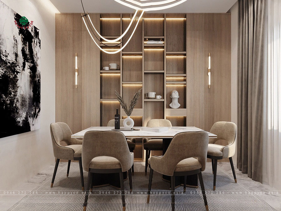 Phía sau bộ ghế ăn chúng ta có hệ thống tủ âm tường với các ngăn được phân chia rõ ràng. Chiếc tủ này sẽ giúp gia chủ dễ dàng trưng bày những vật dụng trang trí hay chai rượu, tạo nên không gian thẩm mỹ hơn. Tiến vào khu vực bên trong, chúng tôi cũng được trang bị đầy đủ các đồ dùng phục vụ cho quá trình nấu nướng. Hệ thống tủ âm tường được thiết kế đơn giản, thiết kế giúp người dùng sử dụng dễ dàng.