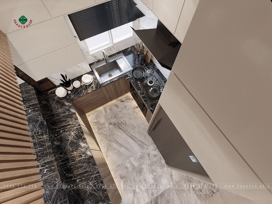 Phòng bếp được thiết kế liên thông với khu vực phòng khách