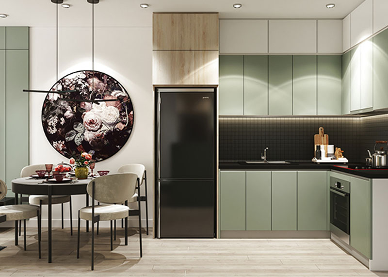 Nhờ cách phối màu trắng – xanh ghi nhạt – nâu gỗ sáng của tủ bếp chữ L với màu đen của tủ lạnh, gạch mosaic ốp tường mà căn bếp 4m2 trông sang trọng,