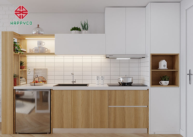 Tủ bếp chữ I lõi MDF chống ẩm phủ Laminate màu trắng – nâu vân gỗ tiện dụng vừa giúp tiết kiệm diện tích vừa kết hợp màu sắc hài hòa với sàn, tường,