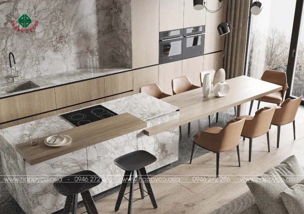 Sự kết hợp giữa bàn đảo bếp và bàn ăn trong cùng một mẫu thiết kế mang lại sự tiện lợi và tối ưu hóa không gian. Bạn có thể nấu nướng và chuẩn bị bữa ăn ngay tại bàn đảo bếp, và sau đó, cả gia đình có thể ngồi quanh bàn ăn để thưởng thức bữa ăn cùng nhau. Điều này không chỉ tạo ra một không gian giao lưu ấm cúng mà còn tiết kiệm không gian và tạo điểm nhấn độc đáo cho căn bếp.