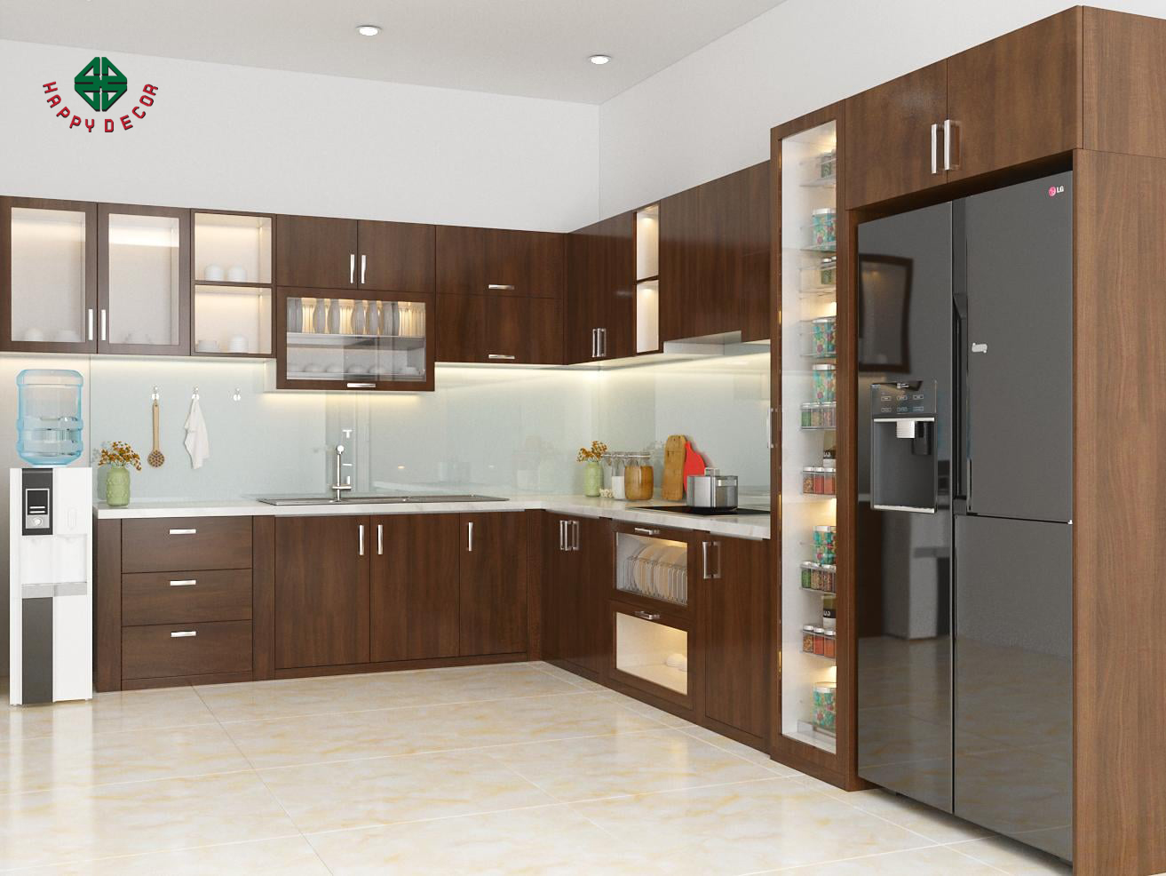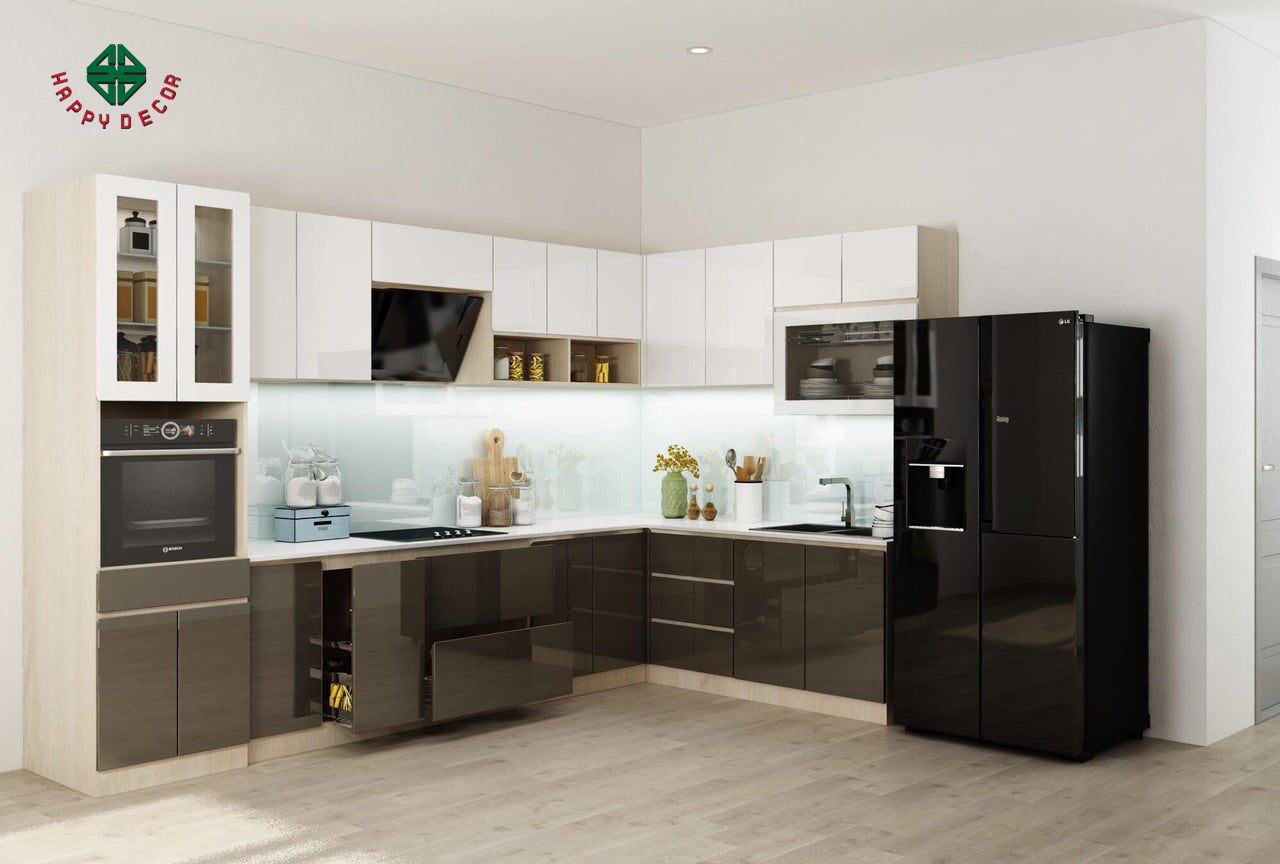 Tủ bếp acrylic kiểu dáng chữ L rất được ưa chuộng, phù hợp với không gian bếp có góc. Mẫu tủ bếp này thẩm mỹ cao và tối đa được công năng sử dụng