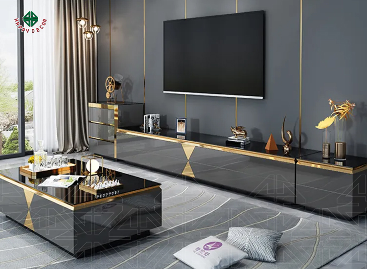 Bộ kệ tivi và bàn trà dáng thấp có thiết kế và màu sắc rất ấn tượng.