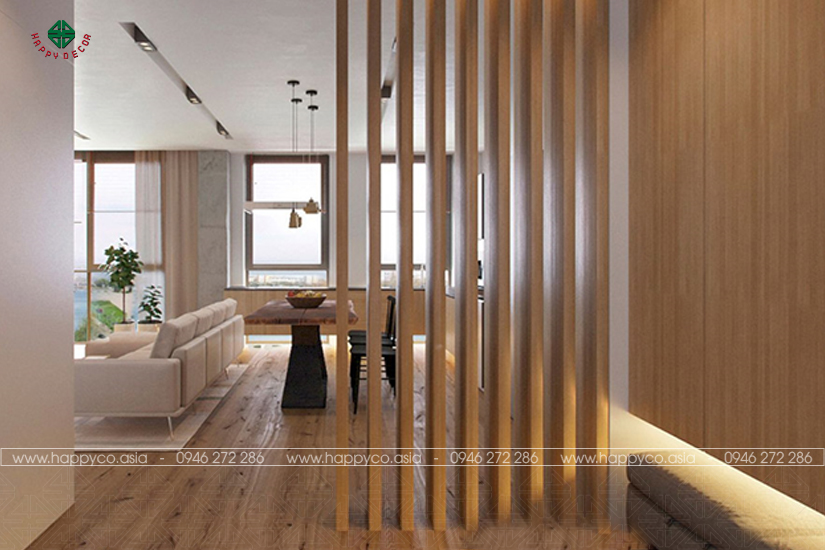 Vách gỗ ngăn phòng: Vách gỗ được sử dụng để tạo không gian riêng tư cho phòng khách hoặc tách biệt giữa phòng khách và phòng ăn.
