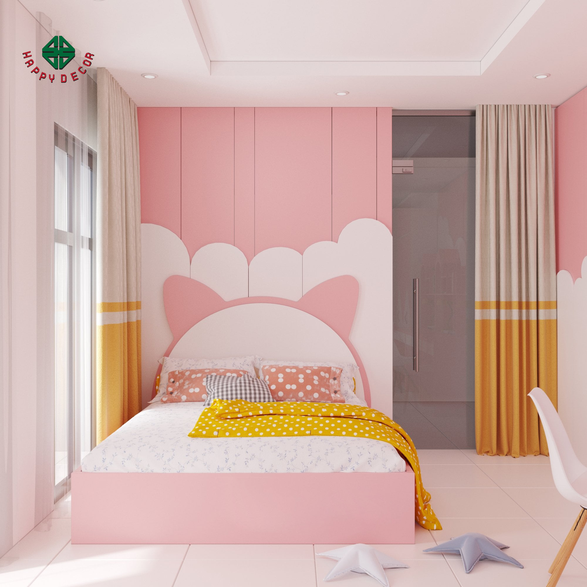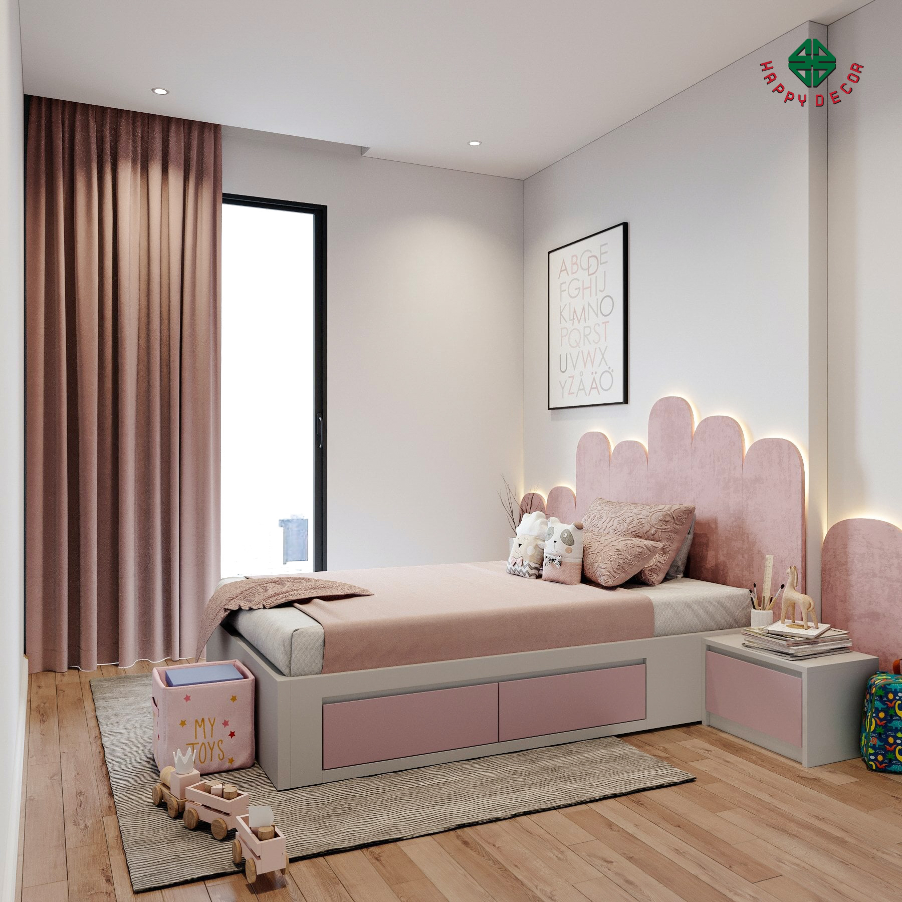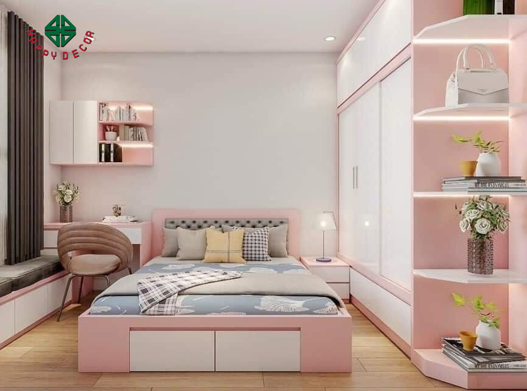 Giường ngủ kết hợp với tủ đầu giường màu hồng
