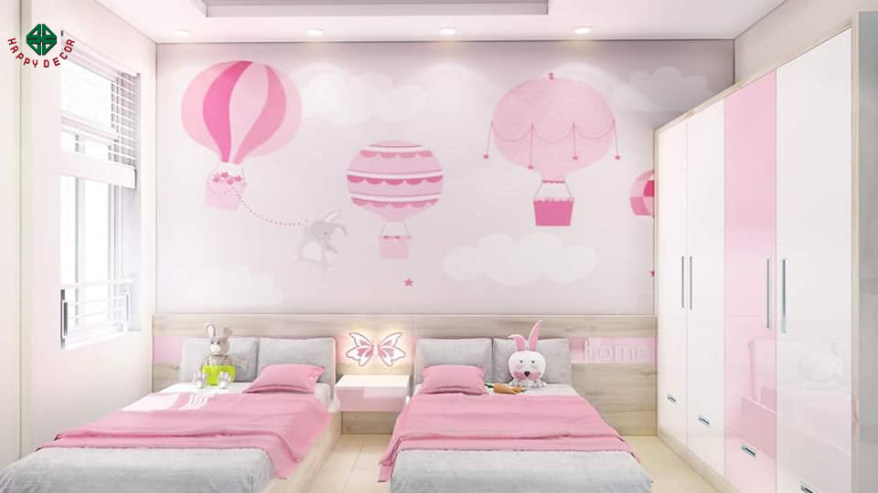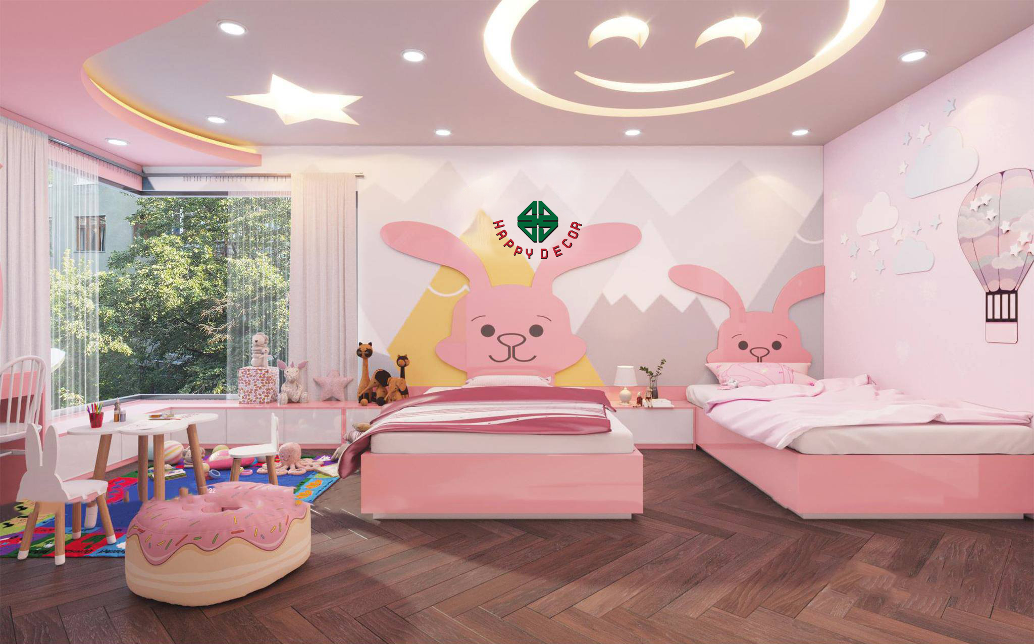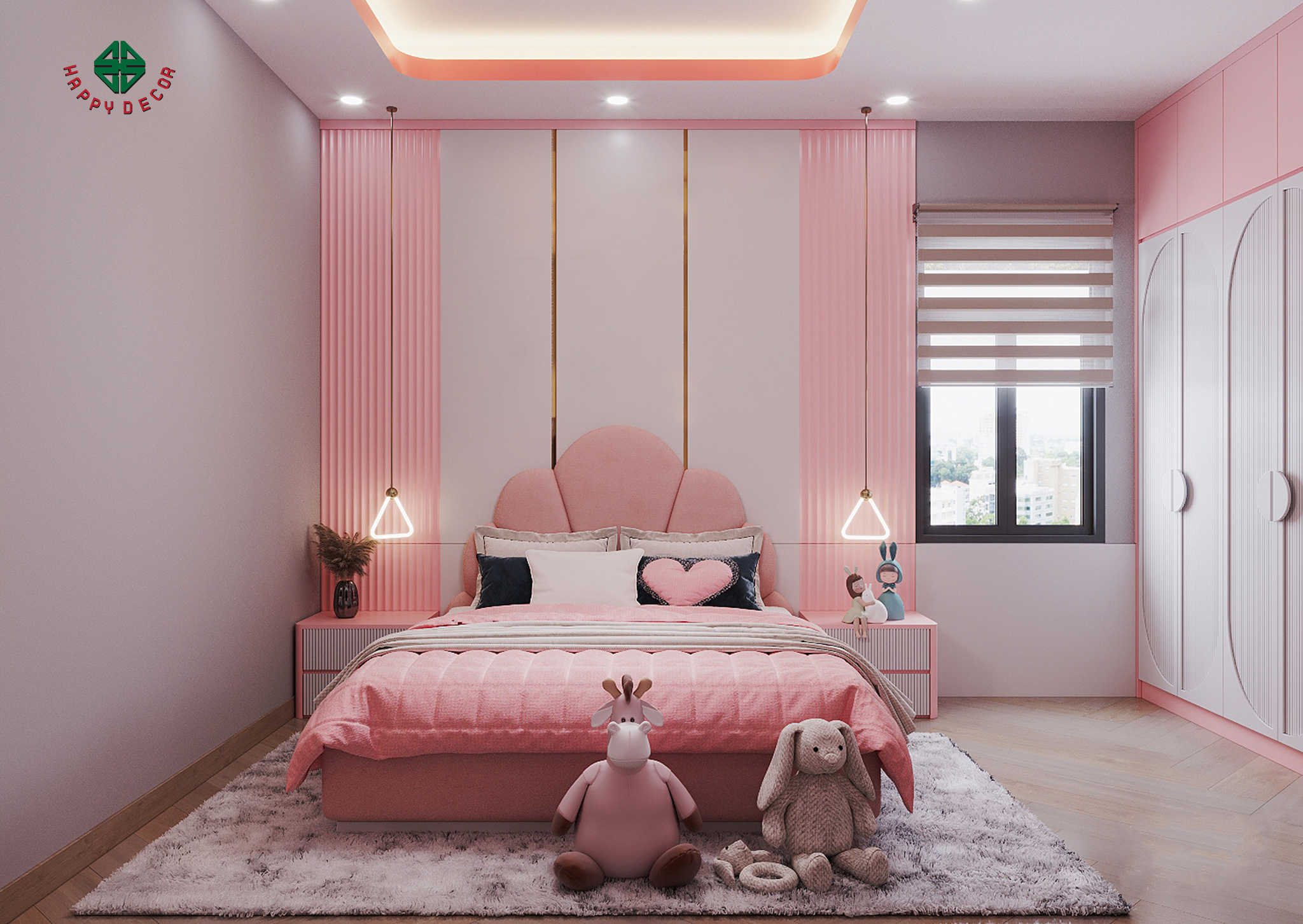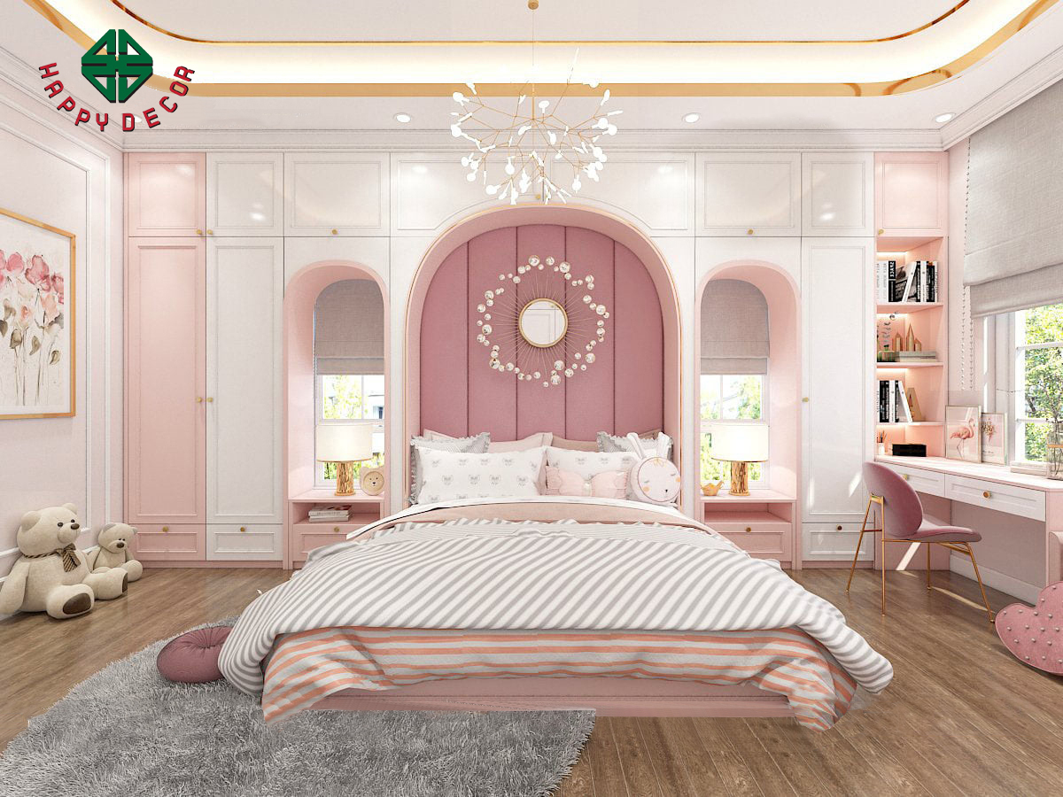 Giường ngủ kết hợp với tủ đầu giường màu hồng