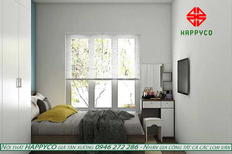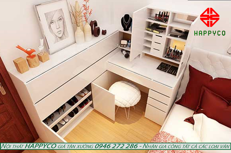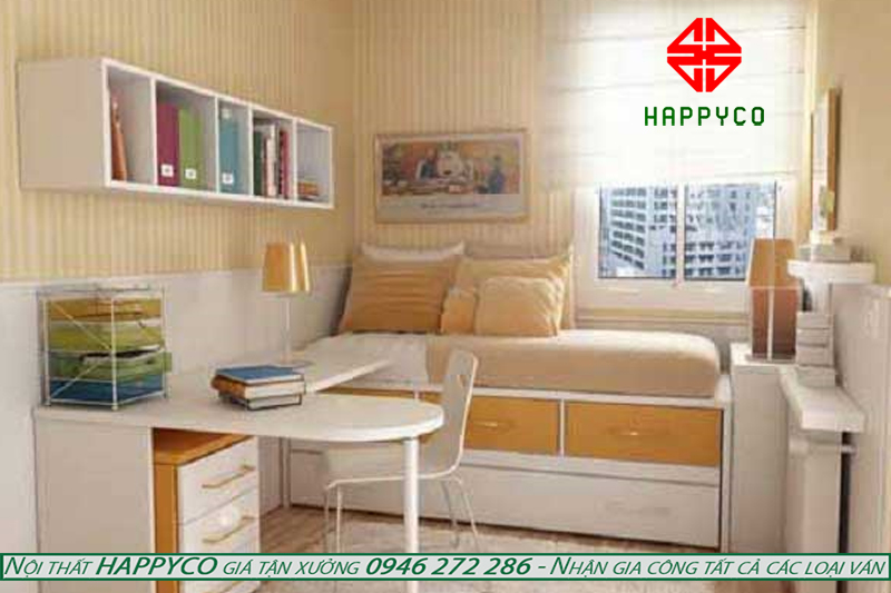 Một căn phòng ngủ nhỏ nhưng có quá nhiều đồ lặt vặt thì chủ nhân nên dùng loại giường có nhiều ngăn kéo bên dưới, hay như một chiếc tủ đứng kê sát tường có chứa góc học tập, hoặc bà trang điểm có thể kết hợp làm bàn làm việc.