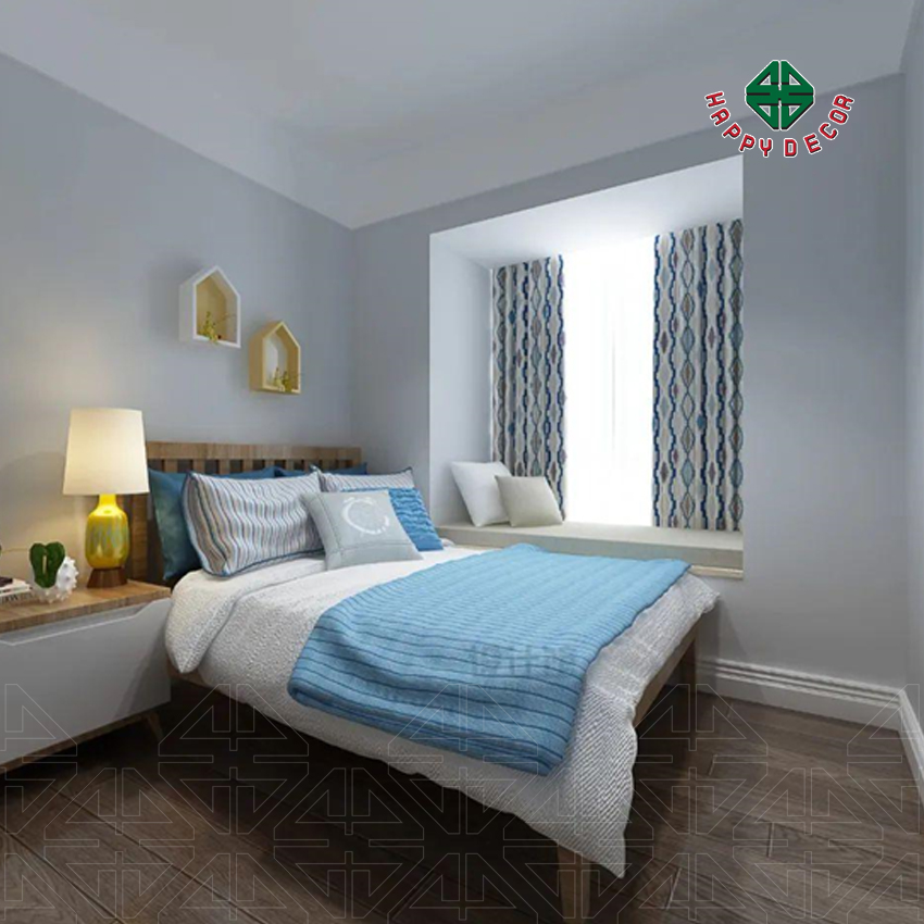 Các vật liệu trang trí cứng trong phòng ngủ chủ yếu tập trung ở tường và sàn, vì không gian này là nơi chúng ta ngủ, thời gian dài và không gian tương đối kín nên vật liệu của tường và sàn nên thân thiện với môi trường ;Sử dụng sơn latex, còn sàn tốt nhất nên dùng gạch lát nền, nếu thích sàn gỗ nên chọn thương hiệu, tránh dùng vật liệu kém chất lượng.