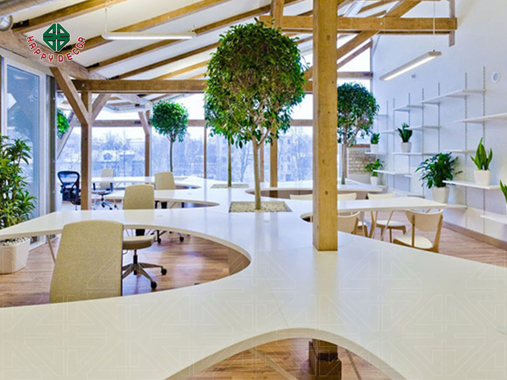 Bố trí nội thất với nhiều cây xanh mang đến sự gần gũi với thiên nhiên. Nghiên cứu cho thấy việc làm việc trong môi trường có nhiều màu xanh sẽ kích thích não bộ giúp làm việc sáng tạo và hiệu quả hơn. Đồng thời, cây xanh giúp điều hòa không khí, giảm bức xạ từ các thiết bị điện tử, đảm bảo sức khỏe cho mọi người.