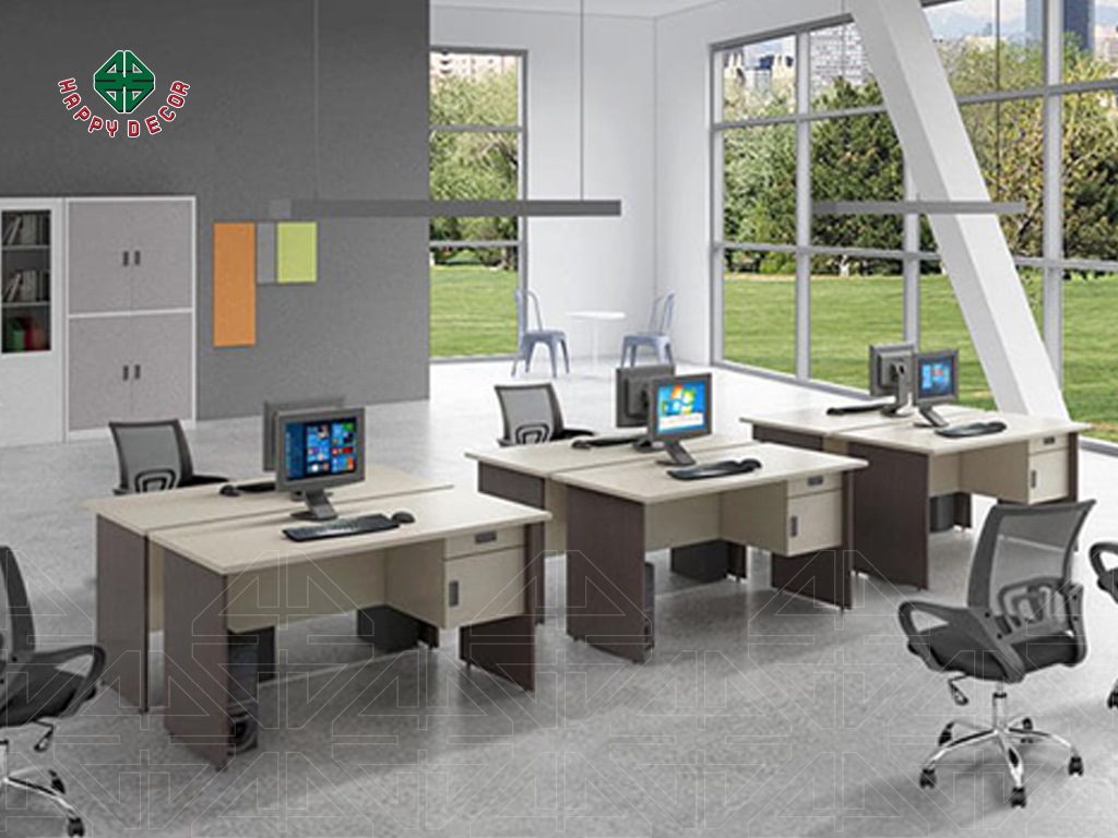 Bàn làm việc của nhân viên văn phòng thiết kế là các dãy kê đối diện nhau hoặc kê sát tường. Loại bỏ máy PC nếu như không thật sự cần thiết cho công việc mà thay vào đó là laptop cá nhân. Như vậy giúp không gian bàn làm việc thông thoáng hơn và cũng tạo sự thuận tiện trong quá trình lưu trữ dữ liệu và di chuyển.