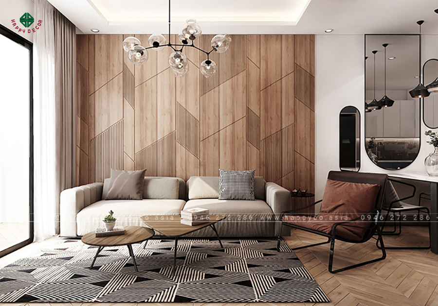 Không gian phòng khách trong chung cư Biên Hòa ấn tượng với những mảng tường ốp đẹp mắt phía sau ghế sofa