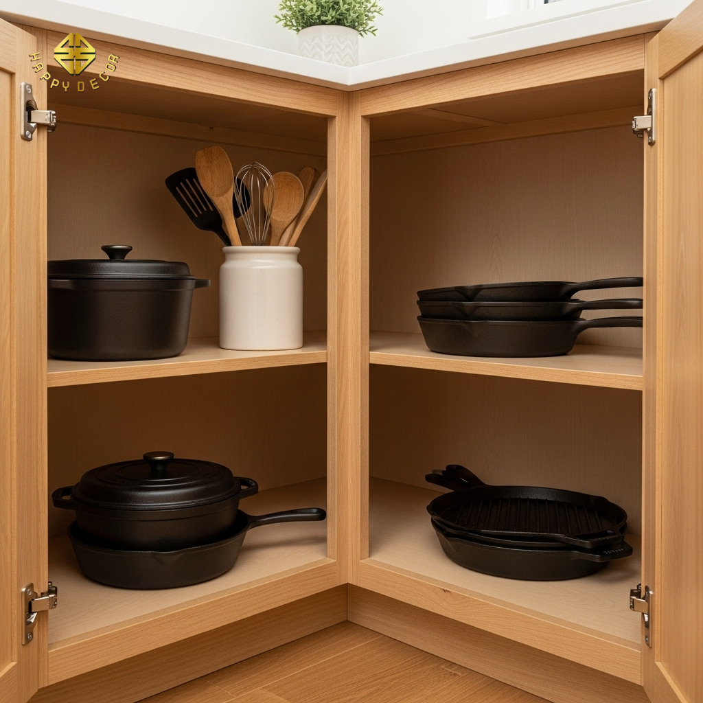 Tư duy thực dụng: Thay vì bỏ ra 7-10 triệu cho một bộ kệ góc liên hoàn, hãy yêu cầu xưởng mộc thiết kế các đợt gỗ rời linh hoạt bên trong hộc góc.