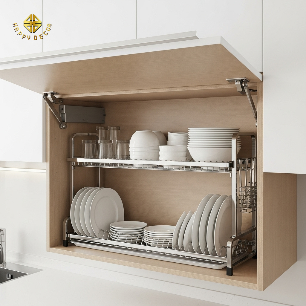 Giải pháp tiết kiệm: Nếu gia đình không quá thấp hoặc không có người già gặp khó khăn khi với cao, hãy chọn giá bát cố định 2 tầng. Về độ bền, Inox 304 gia công thậm chí còn "trơ" với hóa chất tốt hơn các loại hàng mạ. Việc này giúp bạn tiết kiệm ngay lập tức 5-7 triệu đồng cho mỗi bộ tủ bếp.