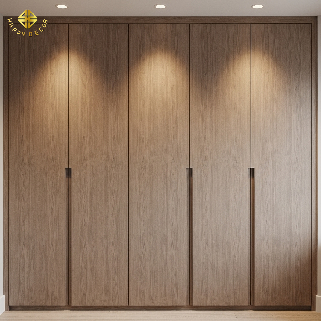 Tay nắm âm tối giản: Kỹ thuật phay tay nắm J-Pull hoặc vát góc 45 độ trực tiếp trên cánh tủ vừa giúp tiết kiệm chi phí mua tay nắm rời, vừa tạo nên vẻ đẹp hiện đại, phẳng phiêu và không bao giờ lỗi mốt.