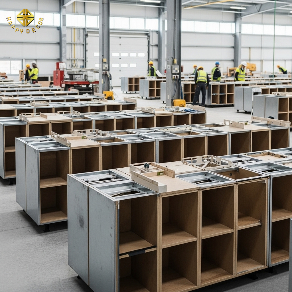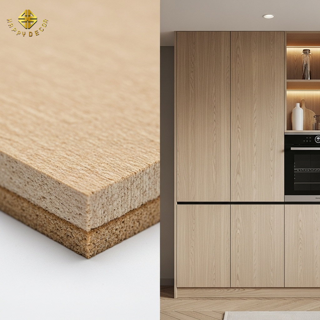 Chiến thuật "Vùng xanh - Vùng đen": Happy Décor tư vấn chia ngân sách vật liệu theo khu vực. Với khoang chậu rửa bếp, chúng tôi bắt buộc dùng HDF Black siêu đặc từ Kho Mộc – dòng ván có khả năng ngâm nước mà không biến dạng. Các khu vực khô như tủ trang trí, vách ngăn có thể dùng ván Lõi xanh (HMR) để giảm chi phí mà vẫn đảm bảo độ bền.