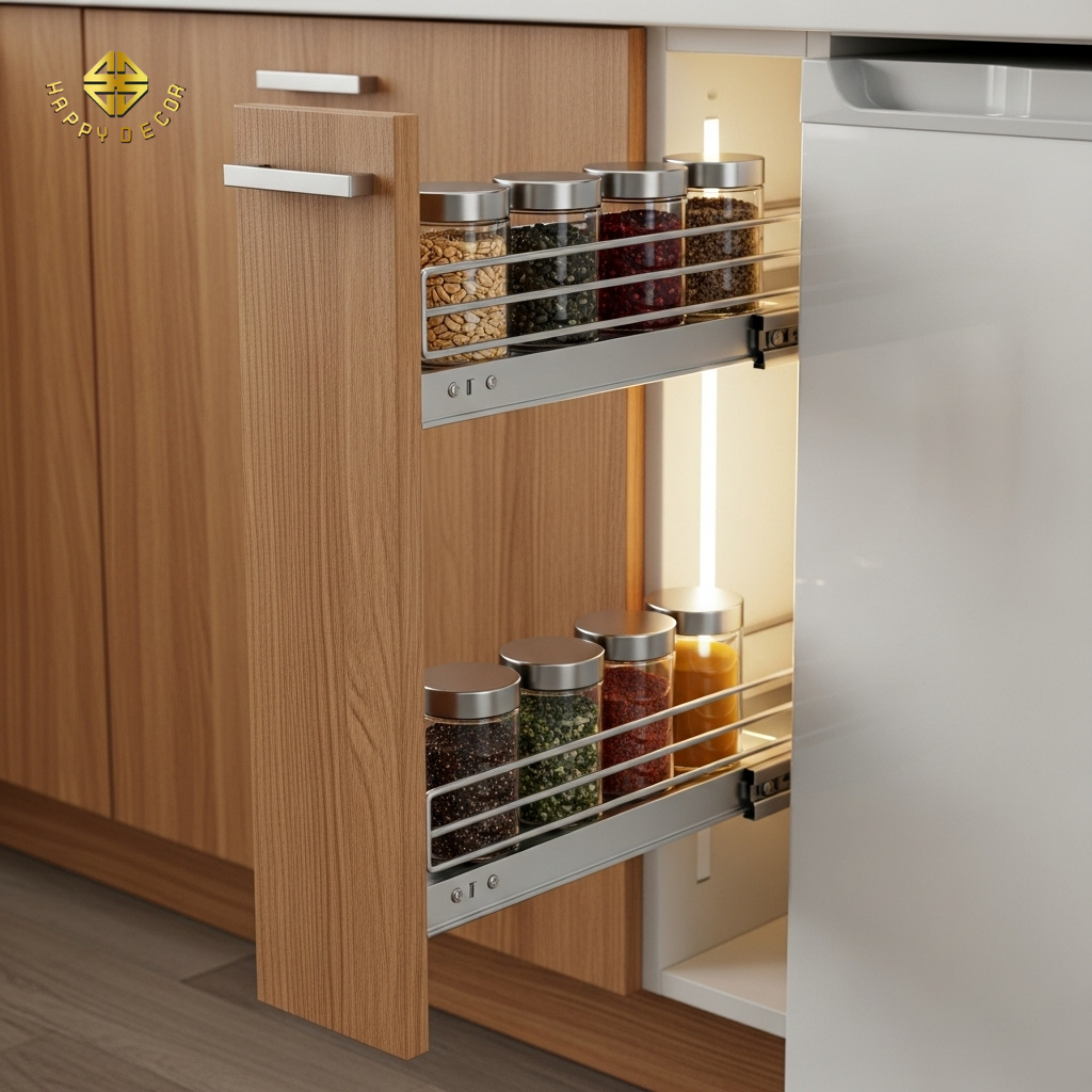 Kệ kéo Slim: Một chiếc kệ kéo chỉ rộng 15cm lắp vào khe hẹp cạnh tủ lạnh có thể chứa toàn bộ chai lọ gia vị, mắm muối một cách ngăn nắp và kín đáo.
