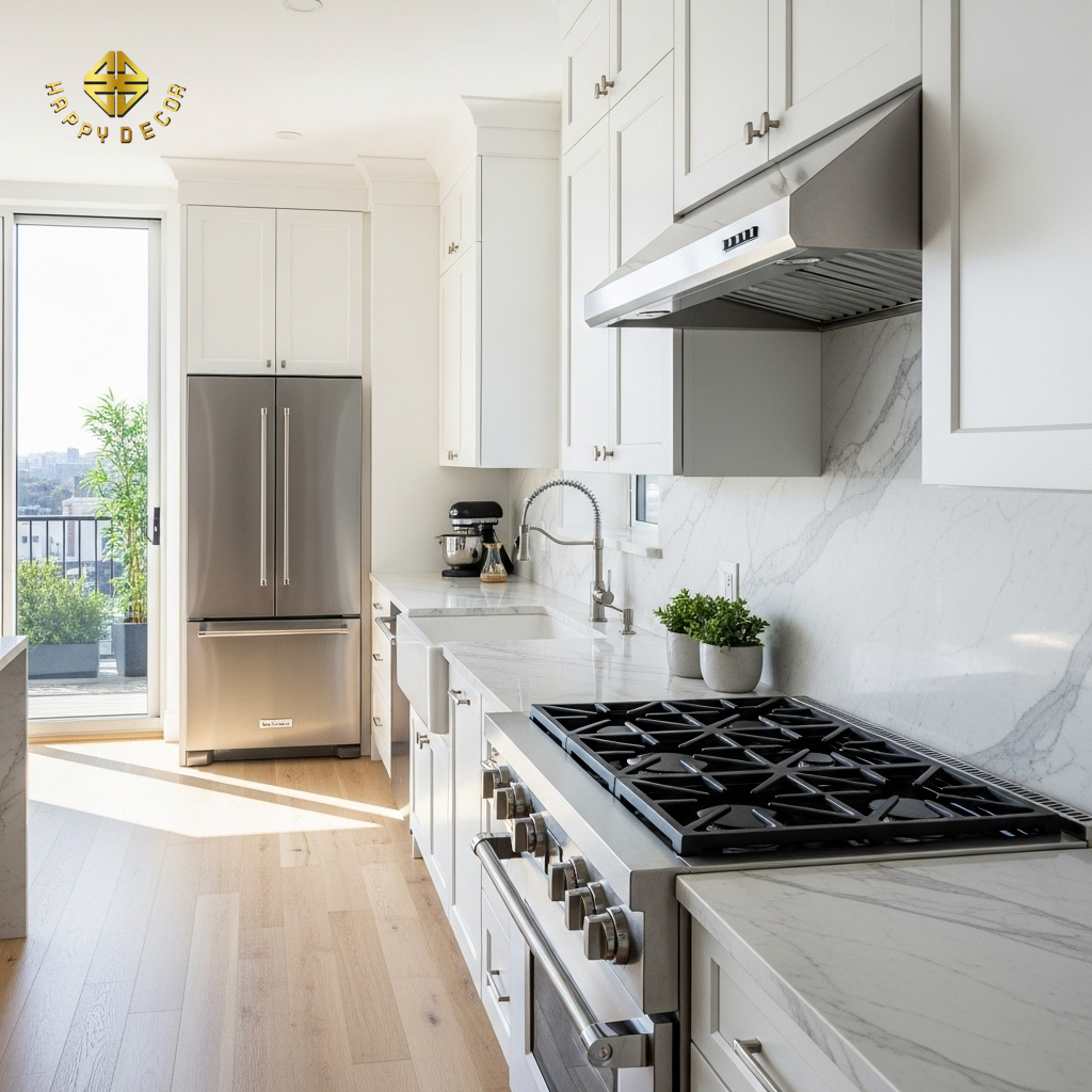 Tại các đô thị lớn, bếp chung cư thường được bố trí ở lối vào hoặc một góc nhỏ hành lang. Thách thức lớn nhất là làm sao để vừa đủ chỗ cho tủ lạnh, lò vi sóng, máy rửa bát, vừa có đủ không gian lưu trữ thực phẩm cho cả gia đình. Câu trả lời nằm ở "Tư duy thiết kế theo chiều dọc" và "Sơ đồ luồng công việc tối ưu".