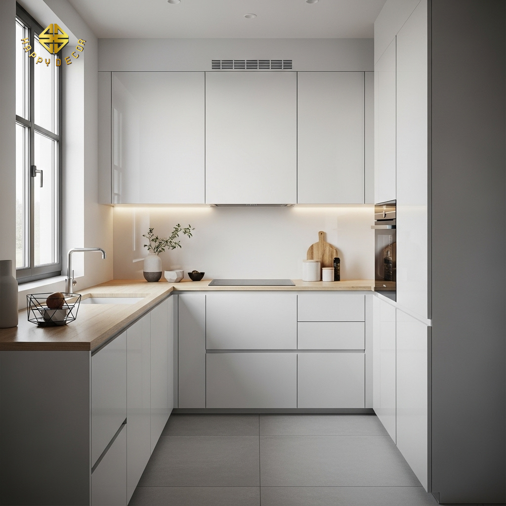 Màu sắc: Hãy ưu tiên sử dụng gỗ công nghiệp phủ Acrylic bóng gương hoặc Melamine màu trắng/kem cho tủ bếp trên. Sự phản chiếu ánh sáng sẽ làm mờ ranh giới của các khối tủ.