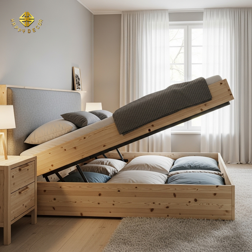 Xu hướng giường hộp (Storage Bed): Với những căn hộ chung cư, giường không còn chỉ để nằm mà còn là một kho chứa đồ khổng lồ bên dưới giát giường. Các ngăn kéo hộc giường được thợ mộc thiết kế tinh tế để lưu trữ chăn màn, quần áo trái mùa, giúp căn phòng luôn gọn gàng.