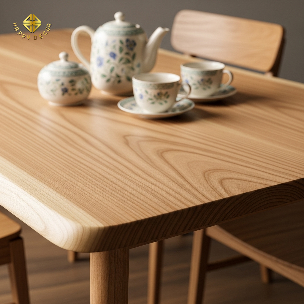 Bàn ăn: Phải có chiều cao chuẩn 75cm để tạo tư thế ngồi thoải mái. Bề mặt gỗ thường được xử lý bo tròn các góc cạnh – một chi tiết nhỏ nhưng thể hiện sự quan tâm của người thợ mộc đến an toàn của trẻ nhỏ.