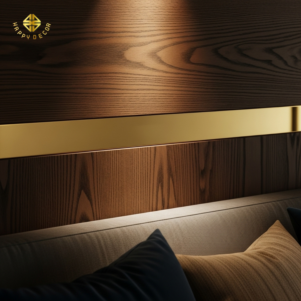 Tư duy thẩm mỹ: Việc sử dụng nẹp chỉ không chỉ để trang trí mà còn có tác dụng che đi những mối nối gỗ ở những mảng tường quá lớn (vượt quá kích thước 1.22m x 2.44m của một tấm ván). Thay vì để lộ vết ghép gỗ thô kệch, việc đặt một đường nẹp inox vàng gương vào vị trí đó sẽ biến nhược điểm kỹ thuật thành một điểm nhấn "luxury" đầy ý đồ.