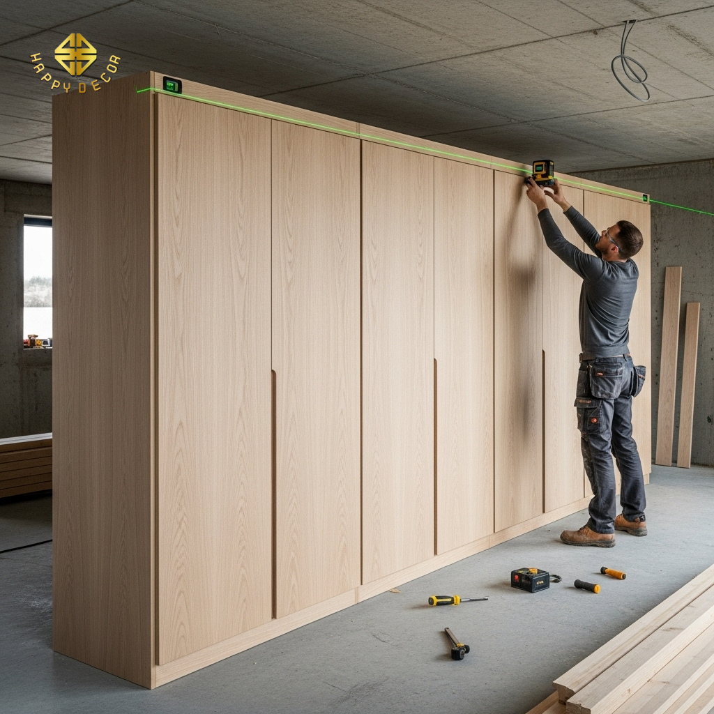 Kỹ thuật xử lý chuyên sâu: Một người thợ lành nghề sẽ sử dụng kỹ thuật "ghép mộng" hoặc dùng vít liên kết âm để kéo các module khít lại với nhau. Sau đó, họ sẽ sử dụng các tấm nẹp che (filler) được cắt tỉ mỉ theo đúng độ nghiêng của trần nhà. Kết quả là hệ tủ trông như mọc ra từ bức tường, không có bất kỳ khe hở rác hay đường nối lộ liễu nào – đây chính là giá trị thực sự của thi công "may đo".