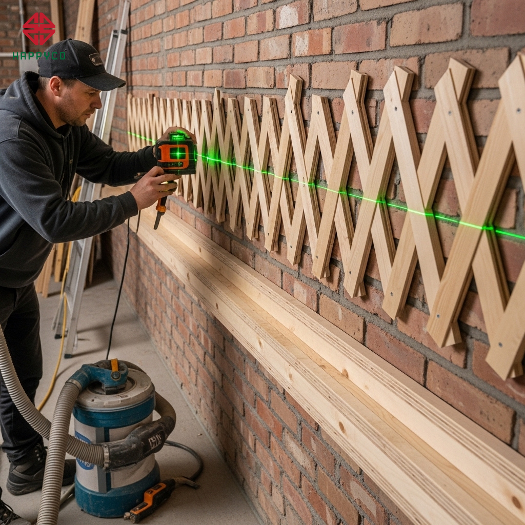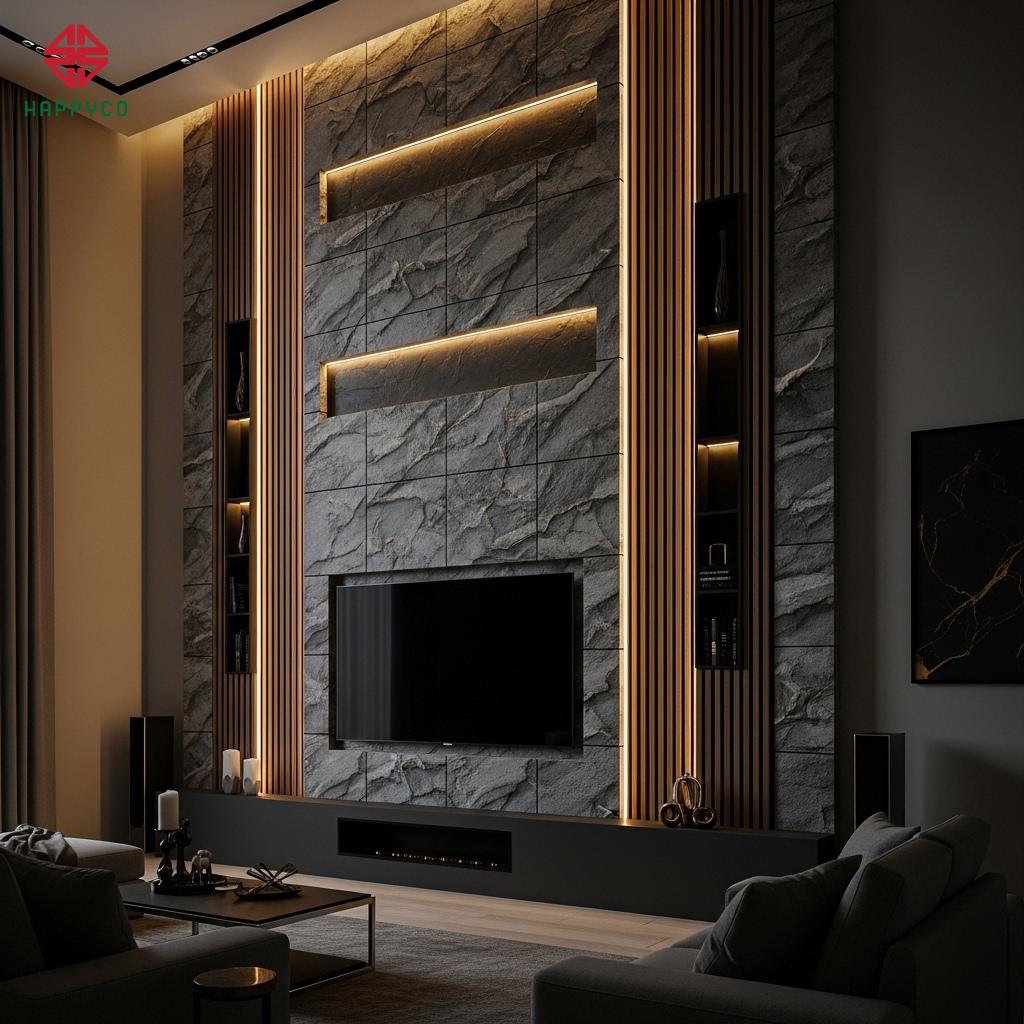 Hệ khung xương độc lập: Chúng tôi không bao giờ dán ván trực tiếp lên tường gạch. Happy Décor xây dựng hệ khung xương bằng ván nhựa Picomat hoặc ván Plywood dày 18mm được bắn chắc chắn vào tường. Hệ xương này được cân chỉnh bằng máy Laser để tạo ra một mặt phẳng tuyệt đối trước khi ốp tấm vật liệu chính lên trên.