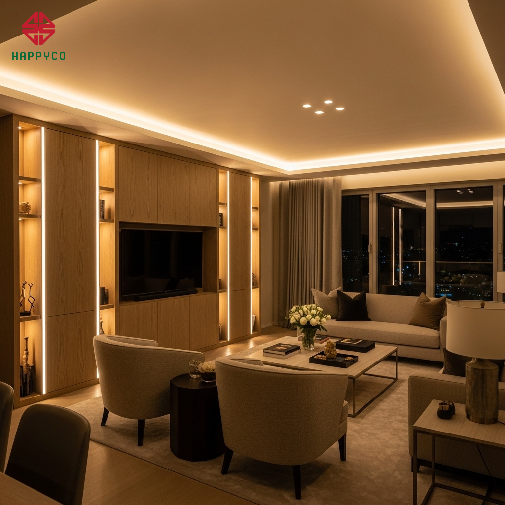 Lớp lang ánh sáng: Chúng tôi thi công hệ thống đèn LED âm tinh tế, tập trung vào những "điểm chạm" quan trọng như vân gỗ hay mặt đá thạch anh.