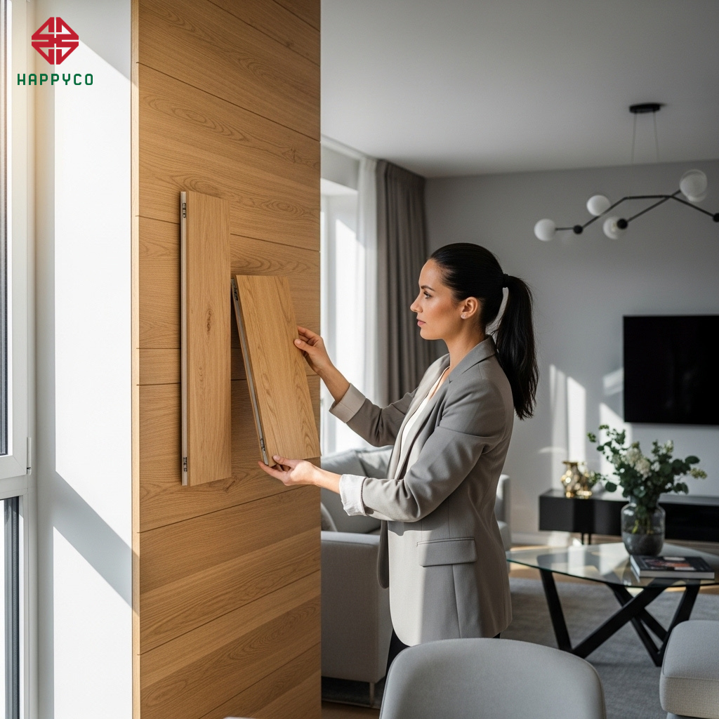 Đối soát mẫu vật liệu: Trước khi sản xuất, Happyco luôn đối chiếu mã ván thực tế dưới nhiều nguồn ánh sáng khác nhau để đảm bảo độ tương đồng 100% với bản vẽ đã duyệt.