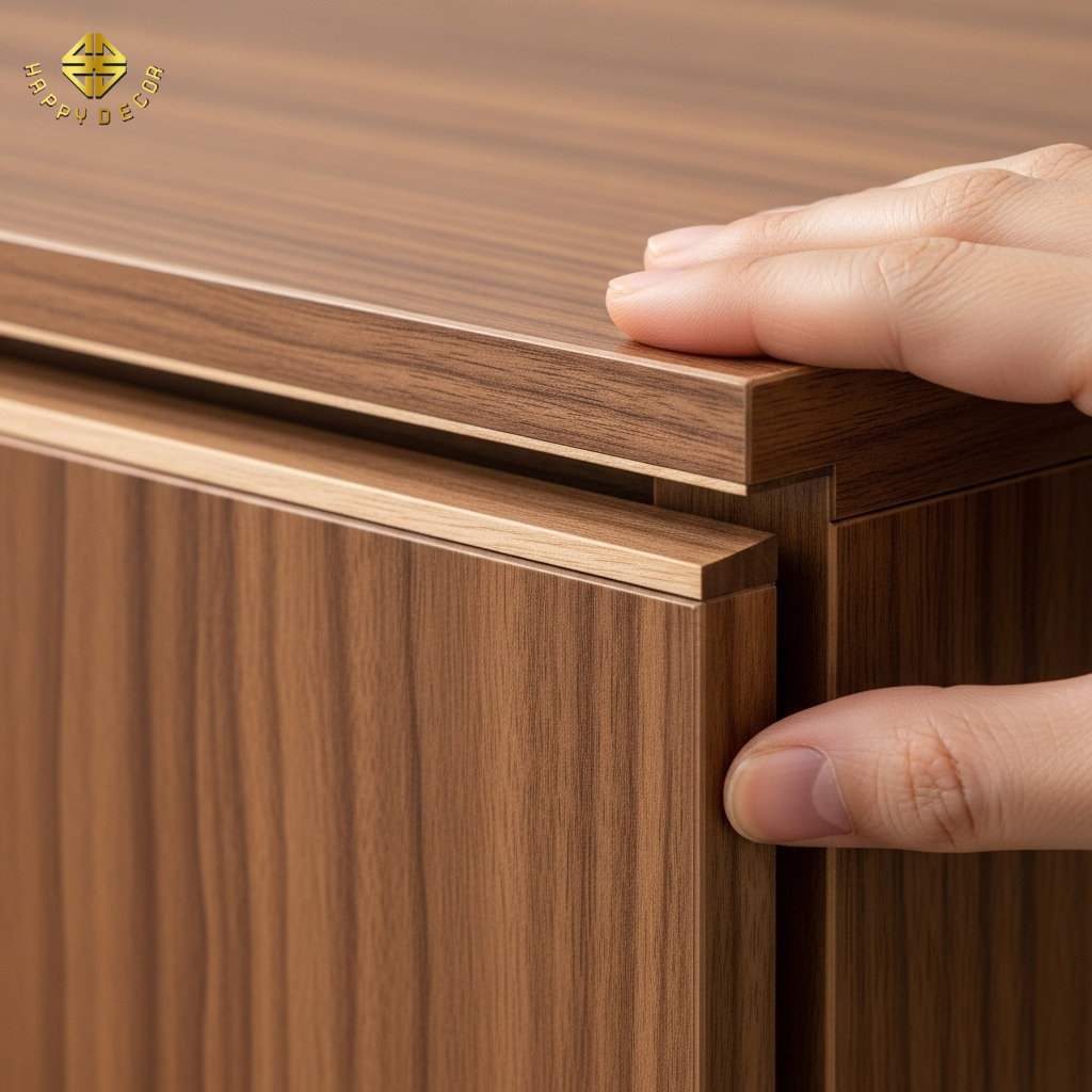 Công nghệ dán cạnh tự động: Happy Décor sử dụng máy dán cạnh tự động với keo chống thấm nước, giúp đường chỉ gỗ và mặt ván hòa làm một.