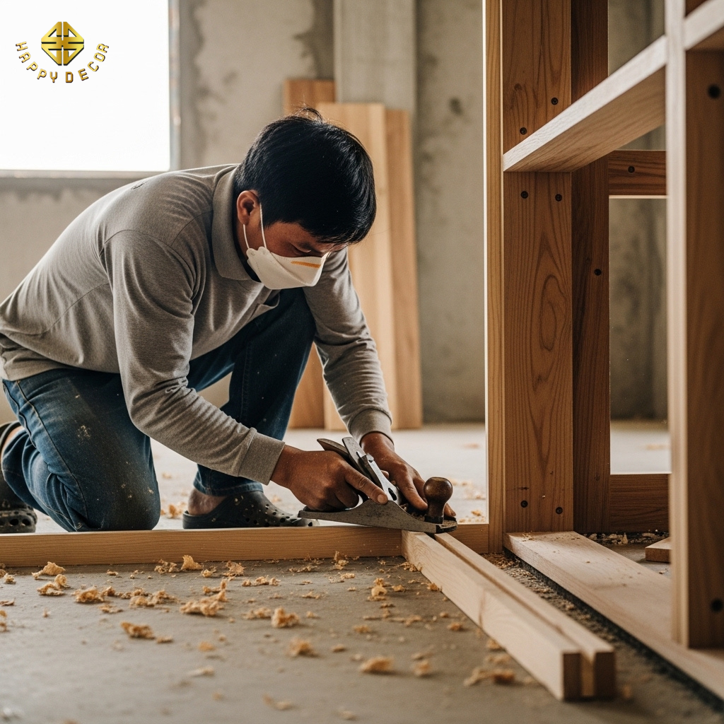 Giải pháp thực chiến: Chúng tôi không sản xuất tủ dựa trên kích thước lý thuyết. Thợ mộc Happy Décor sử dụng máy cân bằng laser để quét toàn bộ mặt phẳng tường.
